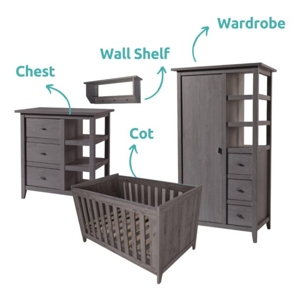 The Lyon Nursery Furniture package is a practical collection that includes the Lyon Cot, Chest, Wall Shelf, and Wardrobe, each crafted with a highly fashionable contemporary look in a dark grey finish.